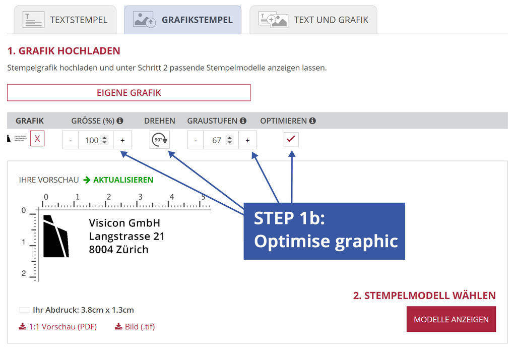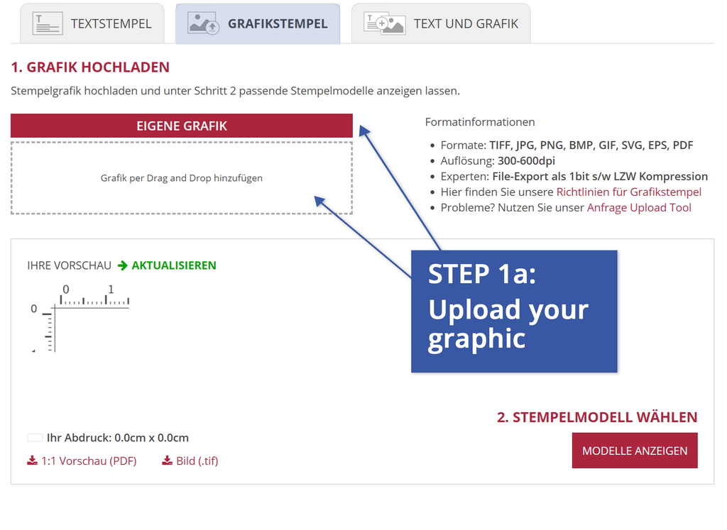 In the first step, you can upload your own graphic in the stamp editor. Pay attention to the following format information for the graphic: