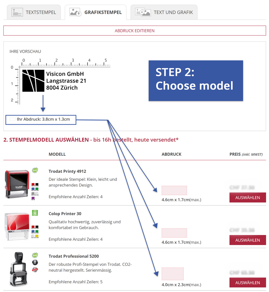 Order stamps EASY: First upload your file, then select model in step 2.