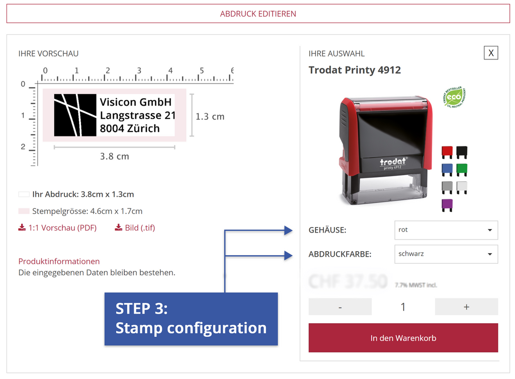 Once you have selected your desired stamp model online, you can configure your stamp model in the third and last step.