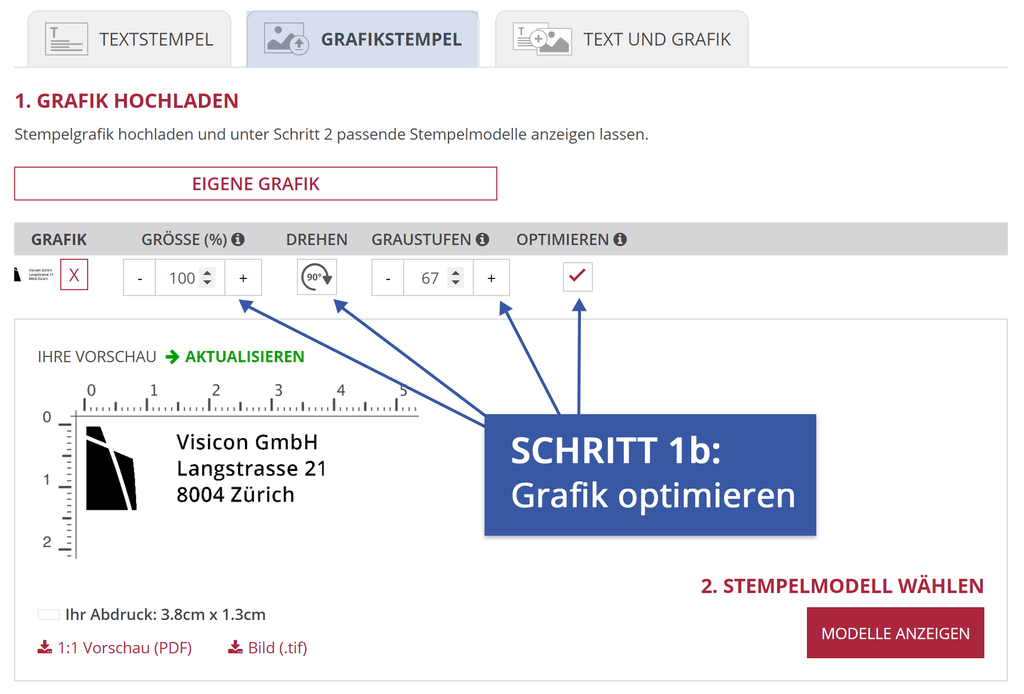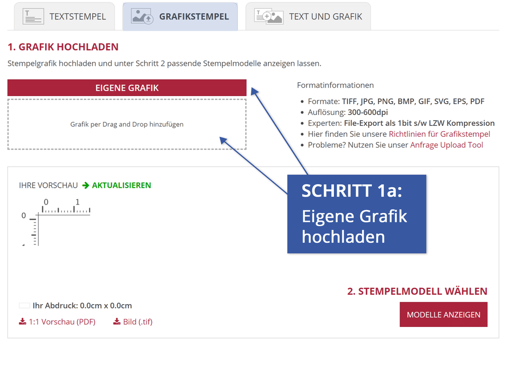 Stempel bestellen easy - zuerst Grafik hochladen, dann Modell im 2. Schritt Stempelmodell wählen.