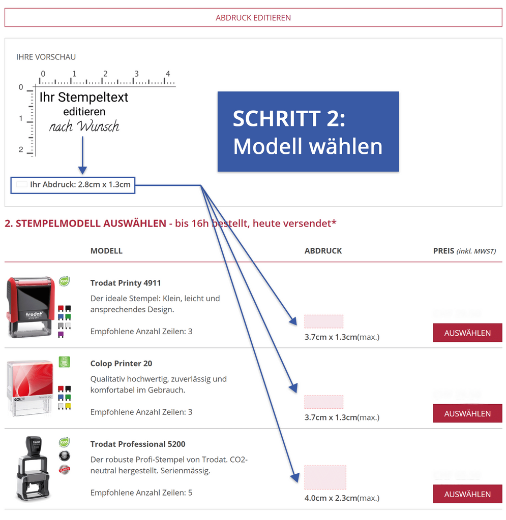 Sobald Sie alles geprüft haben, lassen Sie sich von unserem Shop die passenden Stempelmodelle anzeigen.