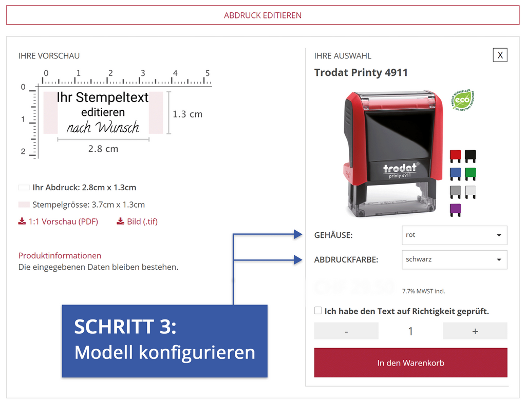 Wenn Sie Ihr gewünschtes Stempel Modell online ausgewählt haben, können Sie im dritten und letzten Schritt Ihren Wunschstempel konfigurieren.